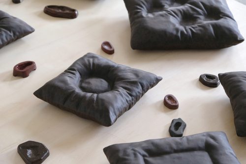漆作家の遠藤は、これまで一貫して漆を用いた作品の制作を行ってきました。自身の住む町内に設置された漆塗りの掲示板《1-6掲示板》(2024)や、フリマサイトで入手した漆器から着想し制作された《マ皿へのオマージュ》(2023)、「そこに何かが置かれていた」痕跡の残るクッションを、漆のもつコーティングと硬化という特徴で留める《名無しの凹み》(2022)など。これらは伝統工芸品としての漆芸品とはまた違う、「批評的漆芸」とでも形容したくなる立体作品です。