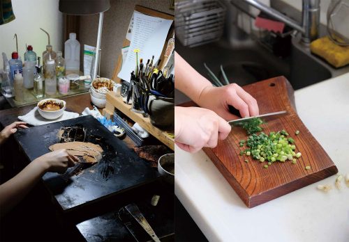 本展は漆の職人が使用する「マナ板」という道具に着目します。「マナ板」とは漆を練ったり混ぜたりと漆を扱うための板で、一般的には定盤(じょうばん)と呼ばれることも多いです。興味深いことに、「マナ板」はその名の通り調理に使う「まな板」と同じ呼び方をされています。調理に使う「まな板」と、漆の「マナ板」。調理用の「まな板」は使用すればするだけ傷がつきますが、漆の「マナ板」は逆に使用すればするだけ艶を増していきます。この相反する関係性を用いて、「傷をつける」こと、その暴力性と同時に宿る装飾性について、考えてみたいと思います。