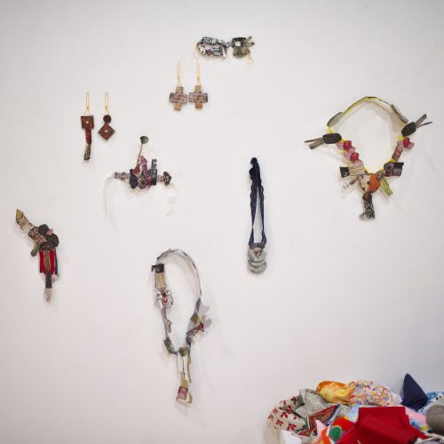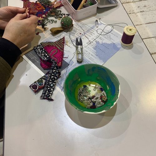 材料は世界旅行でであった布たち。ファッションアイテムとして身につけることのできるバッチを作ります。